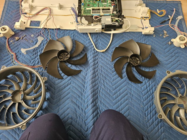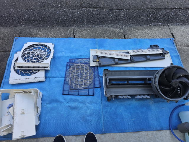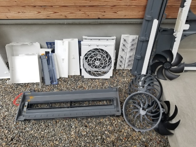 ![]() (分解した外装パネル・ドレンパン・送風ファン) |