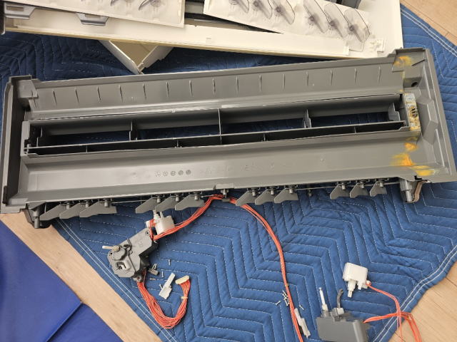 | 外装パネルを外した状態から、 送風ファン・ドレンパン・基板・電装部品を外していき熱交換器だけの状態にしていきます。